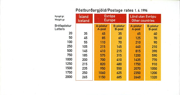 Hinweis: Die Heftchen gibt es in zwei Auflagen, die sich in der linken Innenseite unterscheiden. Die erste Version zeigt das falsche Datum für die Posttarife (1.6.1996) an, während die zweite Version das korrekte Datum, nämlich den 1.5.1997 anzeigt. Von der Erstauflage gibt es nur 1100 Exemplare, d.h., die Zweitauflage umfaßt 14900 Heftchen.