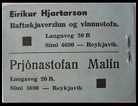 Werbung "Eirikur Hjartarson + Prjónastofan Malín": oberer Teil Hausnummer ohne Punkt (Laugarveg 20 B), Telefonnummer 4690 (Reykjavík mit Punkt), unterer Teil Hausnummer mit Punkt (Laugarveg 20 B.), Telefonnummer 5690 (Reykjavík ohne Punkt). Diese Version gibt es auch bei Heft 5G.