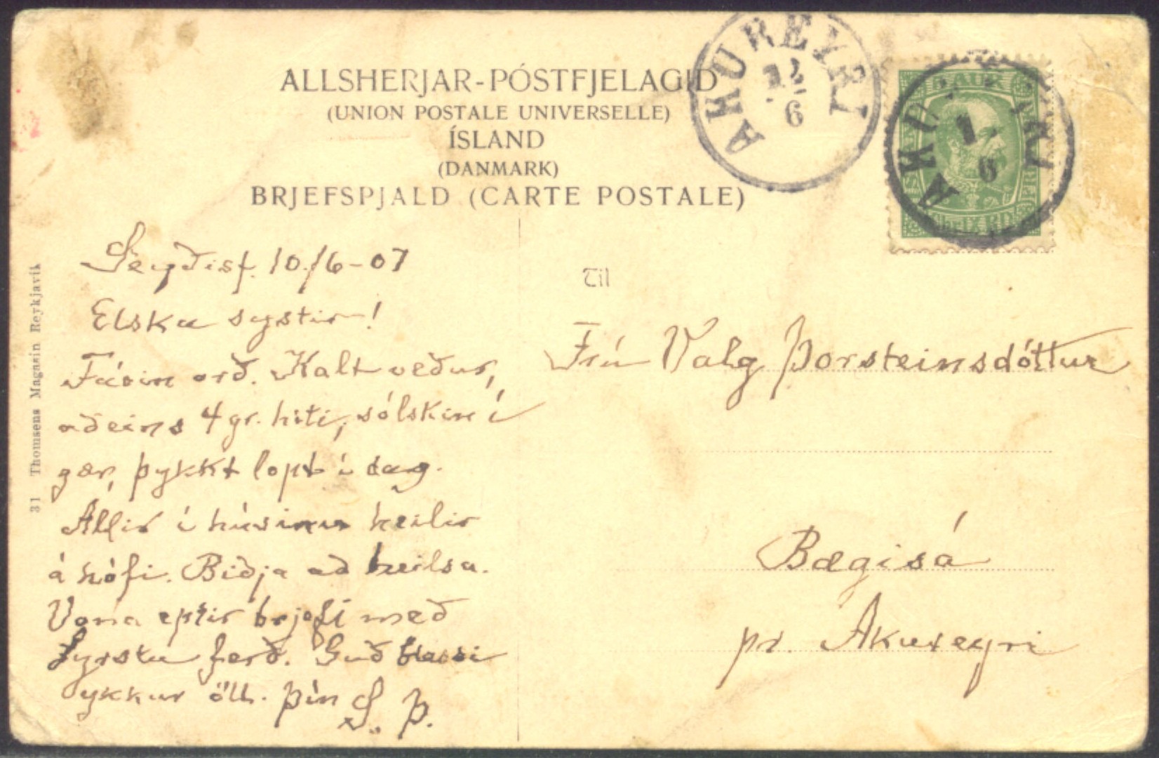 Schiffspost-Karte (Inland) aus Seyðisfjörður (10.6.1907) mit Durchgangs-Stempel AKUREYRI (12.6.1907) - fehlende Ziffer "2" handschriftlich ergänzt. |