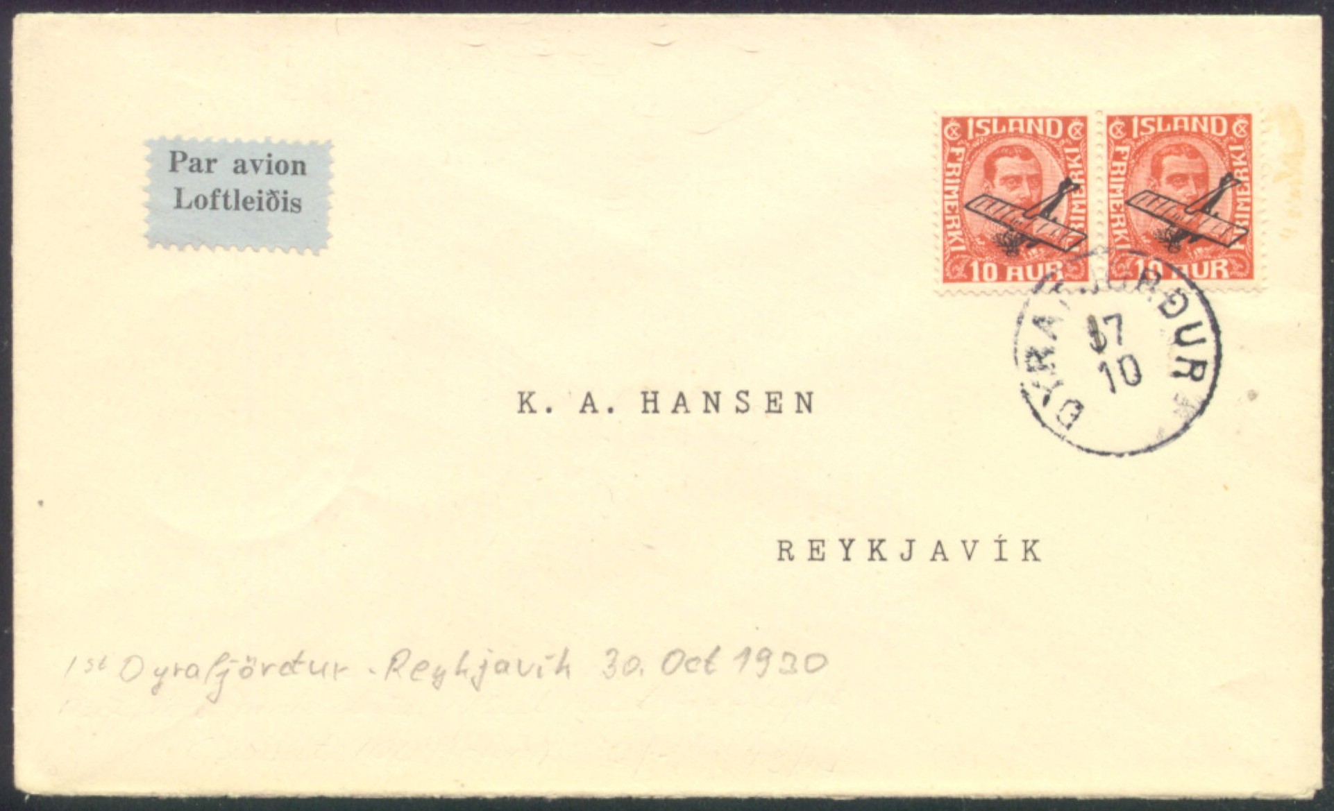 Stempelirrtum: Erstflug vom 30.10.1930. Die Abstemplung erfolgte bereits zwei Wochen früher. Irrtümlich war hier eine "5" im Datum gesteckt worden, die mit einer handschriftlichen "1" korrigiert wurde. Vom 1.10.1930 bis 1.5.1931 wurde die zusätzliche Inland-Flugpost-Gebühr nicht erhoben.